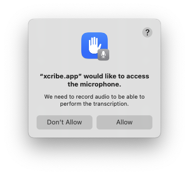 In order to transcribe your voice, xcribe needs access to your microphone.